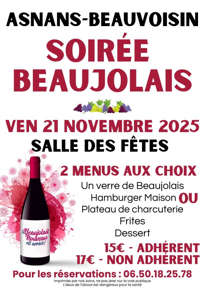 Le Foyer Rural d'Asnans-Beauvoisin vous convie à sa soirée Beaujolais le vendredi 21 novembre. Deux menus au choix, réservations au 0650182578.