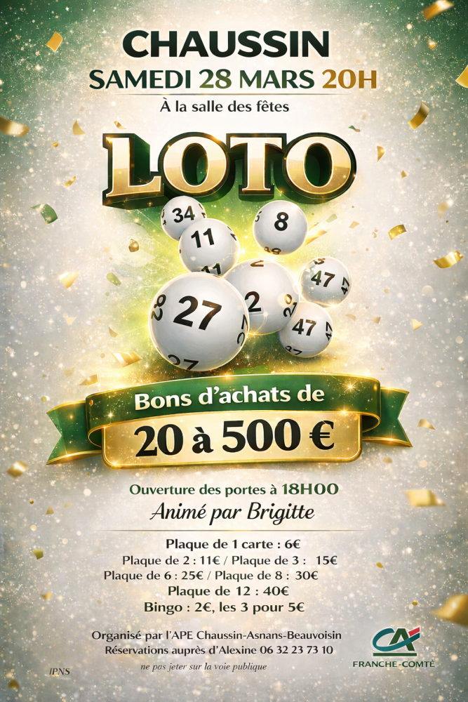LOTO de l'APE SAMEDI 28 MARS 2026 à 20h à la salle des fêtes de Chaussin