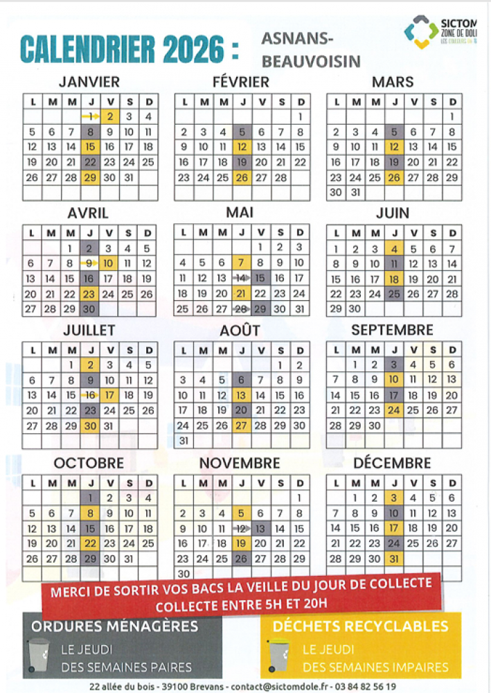 Calendrier de collecte des ordures ménagères pour l'année 2026.