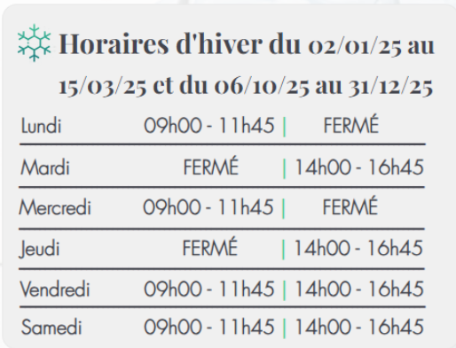 Horaires d'été du 17/03/2025 au 04/10/2025